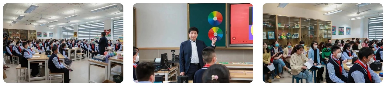 金山农民画为学校美育特色,二者结合,学生们既学习了课本中的色彩知识,又能接触了解家乡的特色文化——非遗金山农民画。侯老师通过带领同学们分析和学习农民画中原色、同类色、对比色的运用,感受不同颜色所表达的情感。