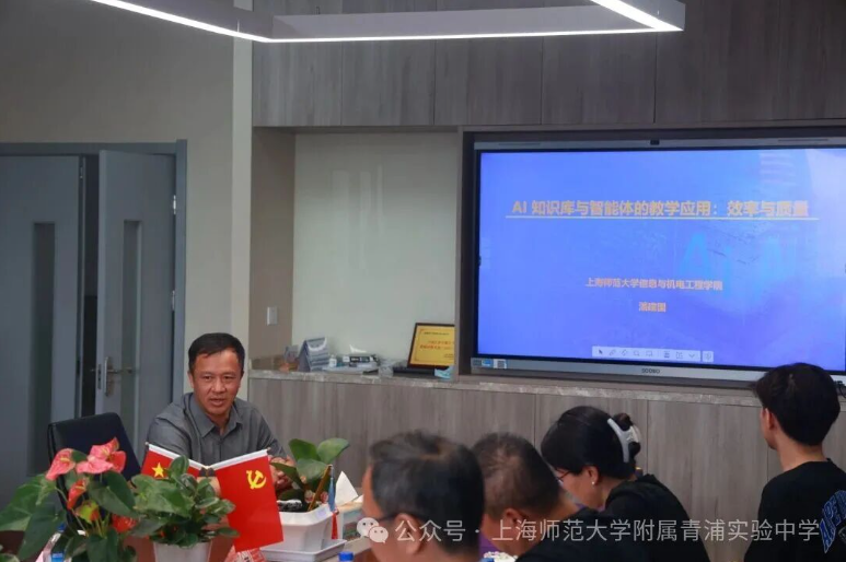 首先,潘建国为附属青浦实验中学教师带来题为《AI知识库与智能体的教学应用:效率与质量》 的专题讲座。潘教授围绕智能体与AI工具如何有效赋能教学的核心问题,在分析人工智能内涵的基础上,阐述人工智能时代的形成及其显著特征、AI知识库的基础概念、智能体的定义和构成要素,以及人类与AI之间的协作模式,探讨赋能实现的关键策略、重要路径及具体方法。他从效率与质量的角度出发,分享知识库与智能体设计的核心理念、智能体和AI工具的教学应用场景等。