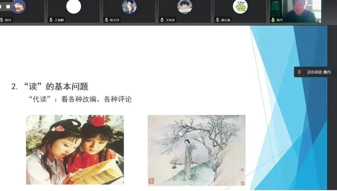 詹教授的讲座深入浅出,通过丰富的例子分析了通读和读通《红楼梦》的要点,显示出高超的学术修养,引发同学们的强烈反响。互动环节,詹教授解答精到,云端气氛热烈。