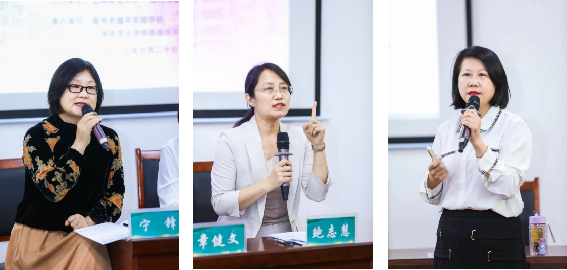浦东教发院教研员章健文、 附属嘉善实验学校校长鲍志慧、 附属浦东临港小学副校长宁锋对三堂语文课给予了高度肯定。章健文老师指出,识字是低年级学生重要的学习任务,汉字教学应与课文语境紧密结合在一起,同时鼓励老师们打开思路,打开境界,认真钻研,注重思维逻辑。鲍志慧校长从“守正”和“创新”两个方面进行细致点评,并建议老师们关于语言的学习要适度拓展,关注语文教学工具性和人文性的有机统一,在学生心里打下文化自信的坚实根基。宁锋校长指出,有效的语文教学活动是学生听说读写的活动,各个方面都应落到实处,同时建议老师们要突出课堂的即时评价,关注学生的个体差异。