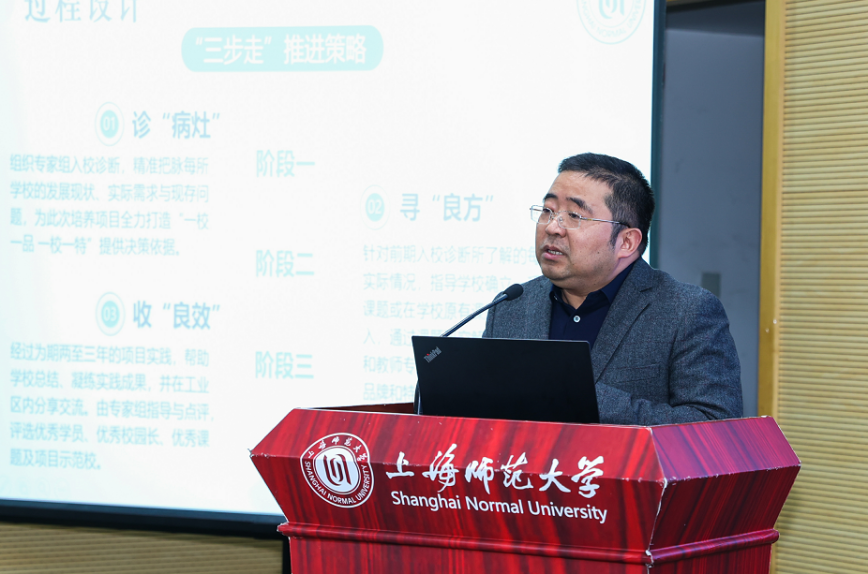 王健致欢迎辞,并介绍项目方案。嘉定工业区智慧教师发展4.0项目面向嘉定工业区种子教师和全体校园长,采取“靶向型”诊断、“伴随式”指导、“个性化”打造的培育模式,通过专家引领和课题驱动相结合,旨在提升嘉定工业区教师专业能力和素养,帮助学校改革课程体系、创新培养模式,着力打造“一校一品 一校一特”办学特色,推动嘉定工业区教育教学提质增效。