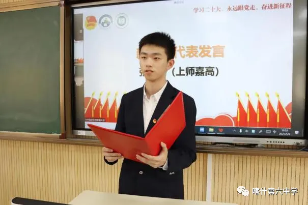 上师嘉高新团员代表张思扬代表发言:作为共青团员,需强化理论学习,践行实践活动。习近平总书记在党的二十大报告中对青年一代提出了殷切希望,吾辈恰逢世界百年未有之大变局,要更加坚定理想信念,不负使命担当。号召各位团员紧紧团结在党组织、团组织的周围,绽放属于自己的光芒,为社会发展与中华民族伟大复兴贡献出一份力量!