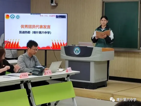 喀什附中优秀团员代表凯迪热耶代表发言:作为一名共青团员,我不曾忘记自己的入团初心,坚定不移跟党走,不断地锻炼自己,以实际行动发扬带头模范作用,服务学校,帮助他人,成为具有优秀品质、良好素养的新时代团员。正如习近平总书记说的,青年犹如初升的太阳,不断积聚着能量,总有一刻会把光和热洒满大地。让我们共同努力,以团旗为标杆,以团徽为荣耀,在泥泞中追求理想,在汗水中散发光芒,让我们携手共进,为伟大理想而奋斗!