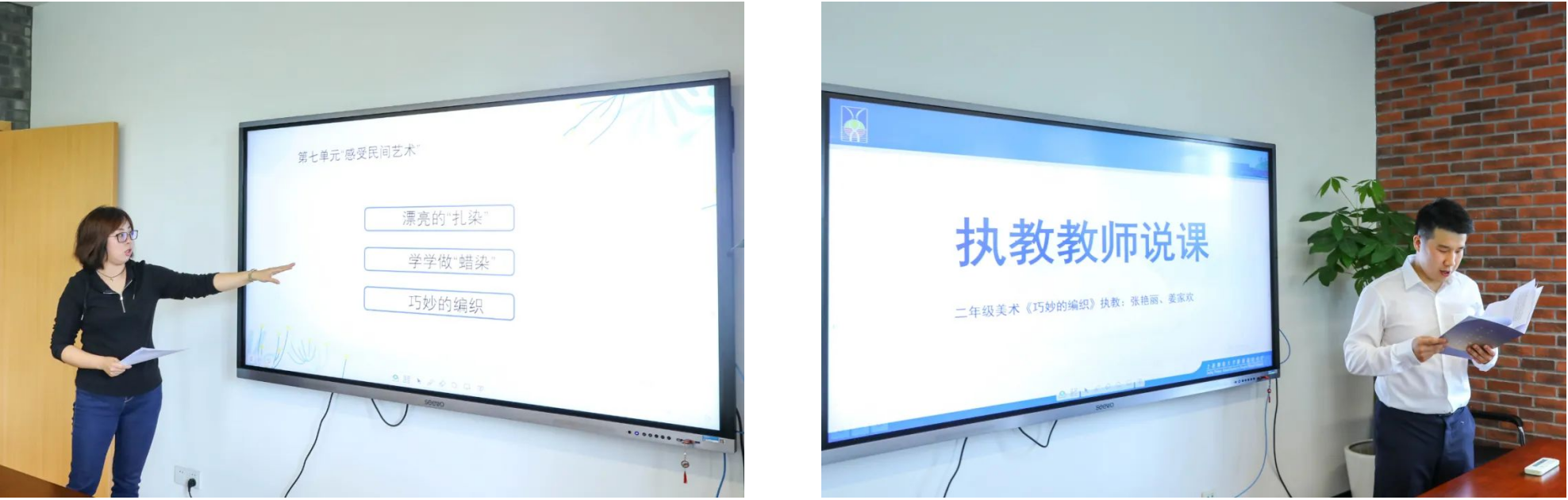 与此同时,在K二楼会议室里,美术同课异构的研讨也在如火如荼地进行着。首先由美术组张艳丽和姜家欢两位老师进行说课。张艳丽从单元主题“感受民间艺术”入手,对教材、学情进行了分析,并明确了教学目标和教学重难点,对本节课的学习内容、学生要掌握的学习能力以及教学特色进行了阐释。姜家欢则回顾了自己任务驱动型的教学设计及设计意图,并对自己的课堂生成进行了总结和反思。