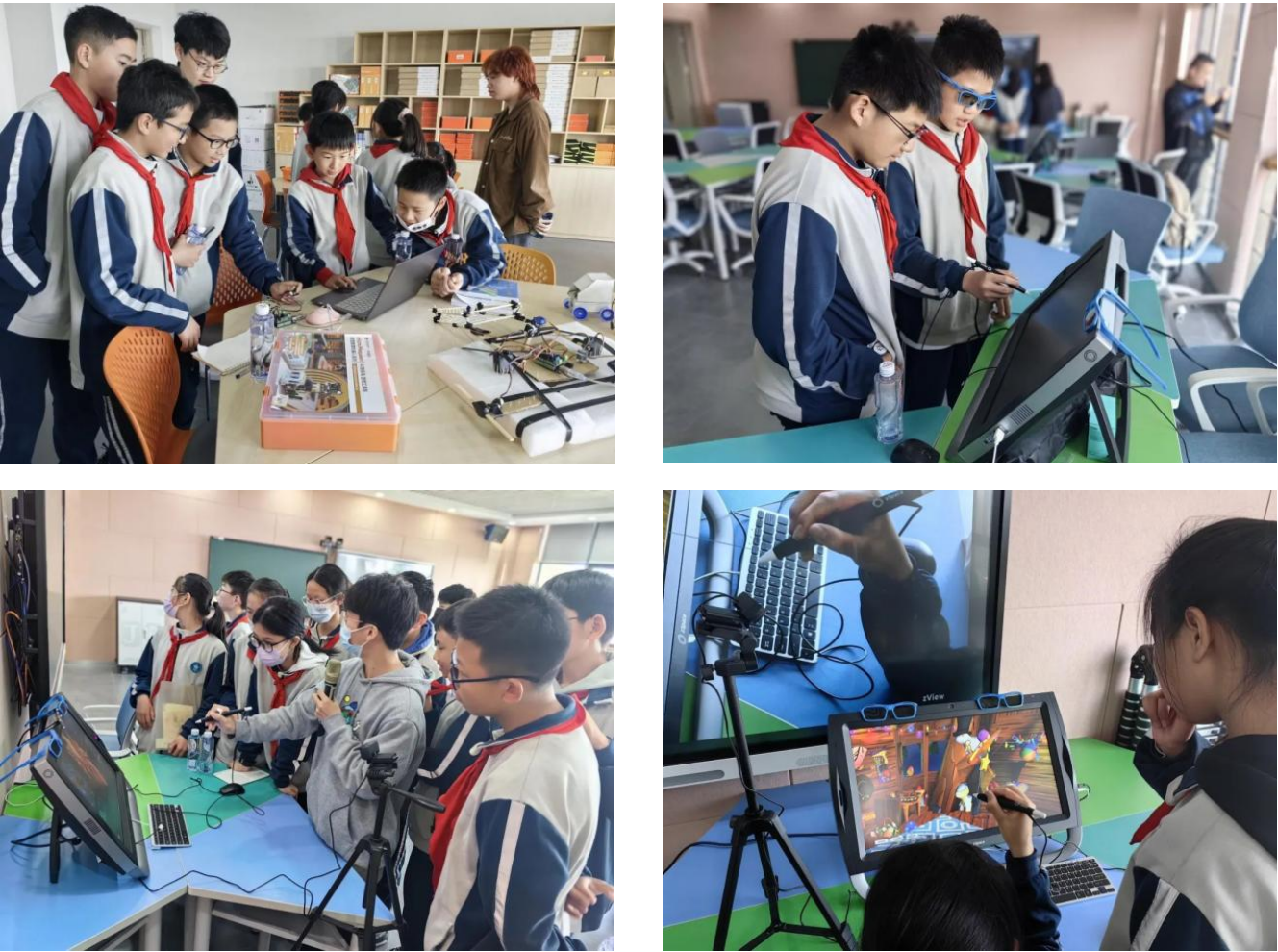 学生们在VR、AR的现实体验空间里与机器互动,畅游沉浸在虚拟的空间里,拓展了学生们的视野和思维,提高学习兴趣和效果。