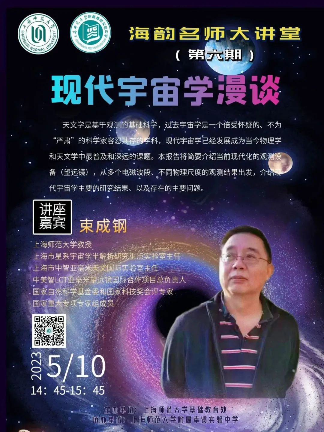 5月10日下午, 束成钢教授应邀为 附属奉贤实验中学的学生开设科普讲座《现代宇宙学漫话》,本次讲座由附属奉贤实验中学六年级年级组长陈柯吉主持。