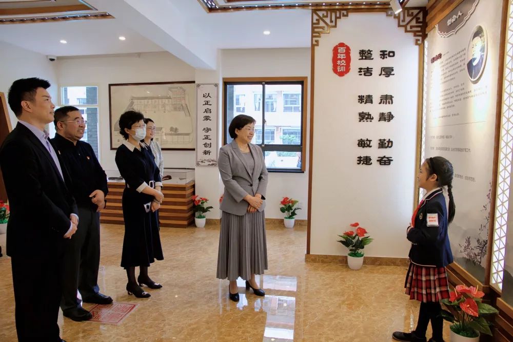 首先,袁园一行走进校史室,在红领巾讲解员的解说下,听取了学校校史的介绍,在听取的过程中,她非常关心校报《梅讯》在当下的传承与发展,并指出悠久的办学历史是梅溪的一笔宝贵财富,学校的发展要在传承的基础上进行创新。